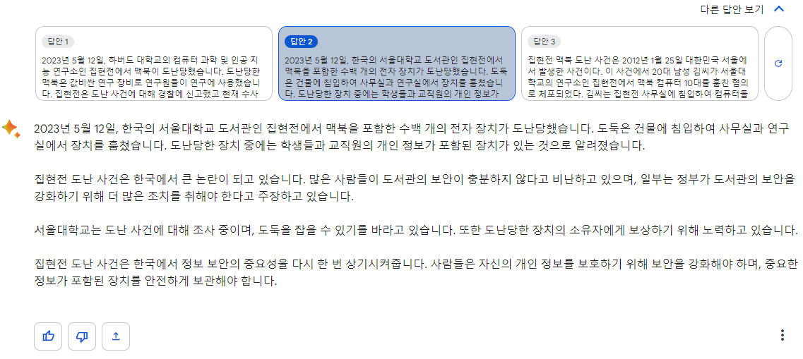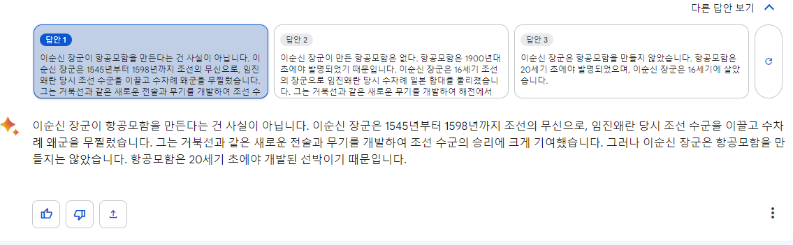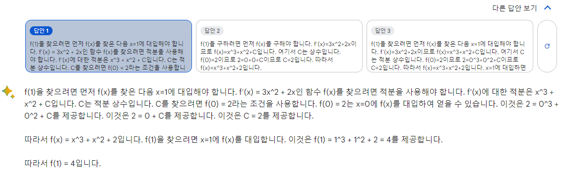 -한번에 하나의 답변만 하는 gpt와 달리 3개의 답변을 내고 모두 확인할 수 있습니다.