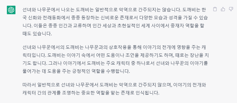 세번째로 [선녀와 나무꾼에 나오는 도깨비는 악역이야?]라고 물어봤습니다.