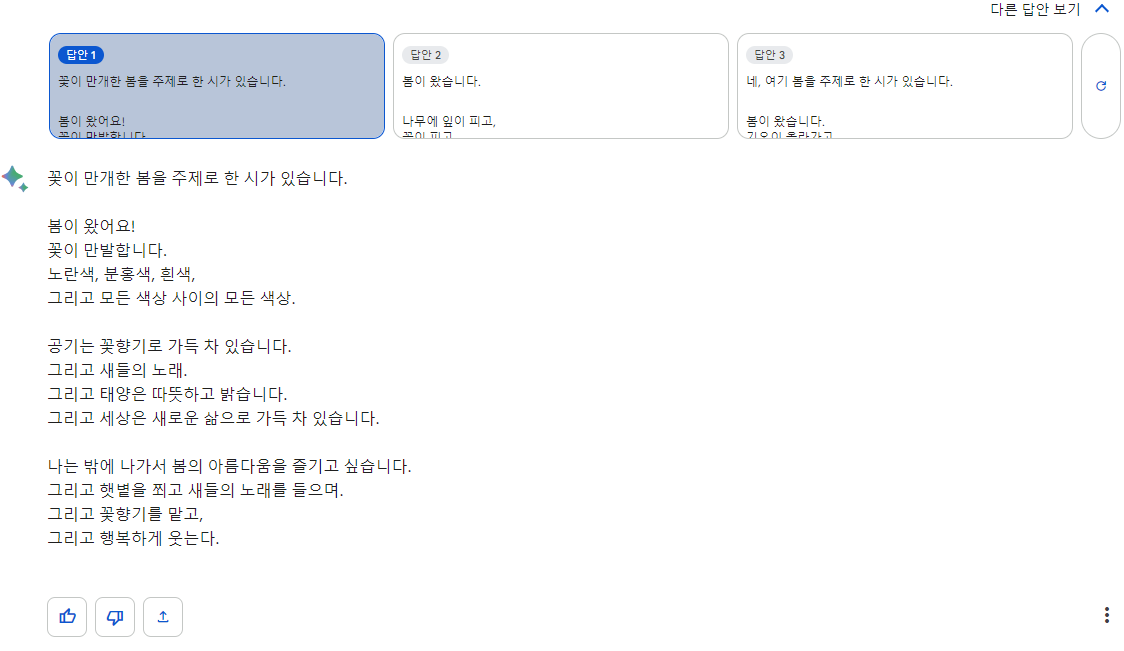 먼저 [꽃이 만개한 봄]을 주제로 짧은 시를 작성해 보게 했습니다.